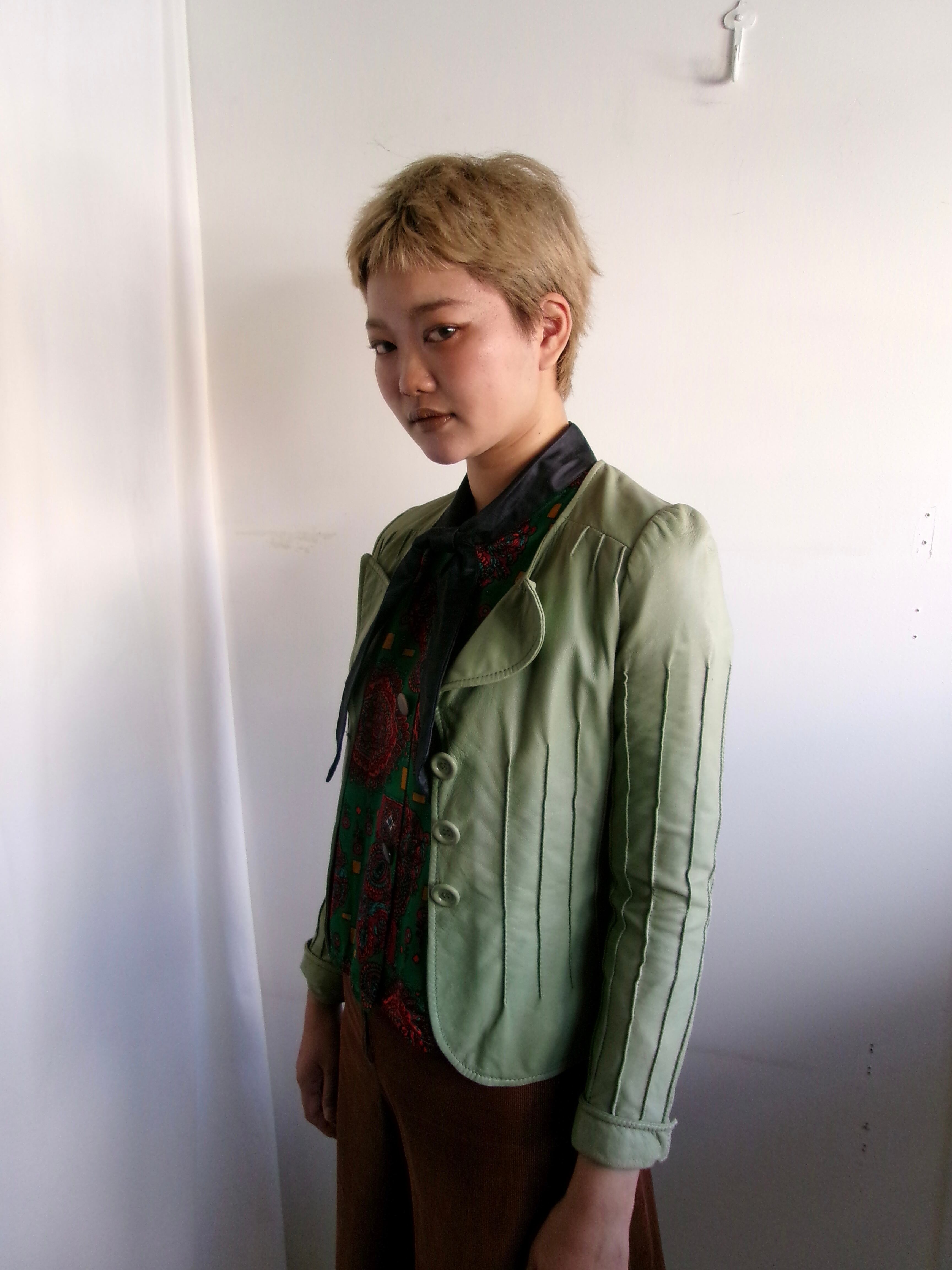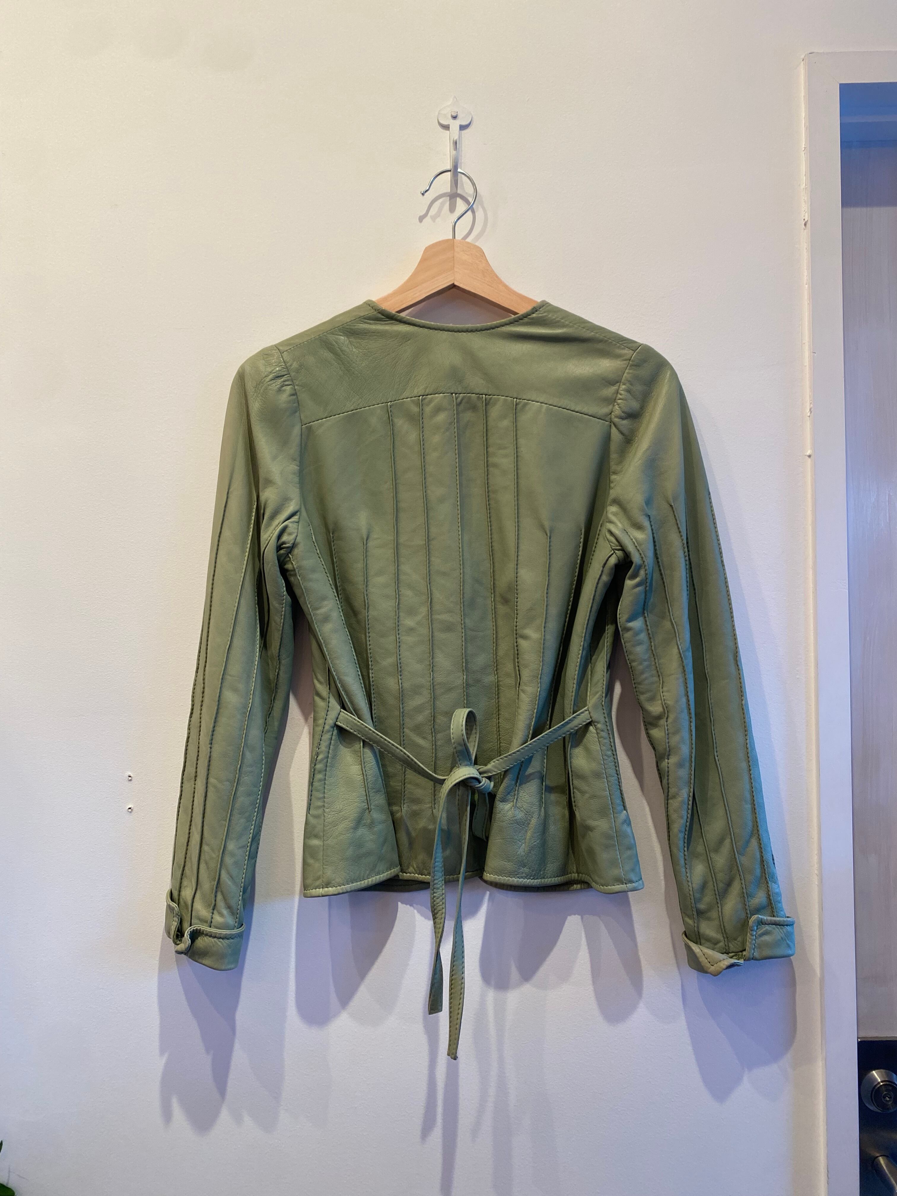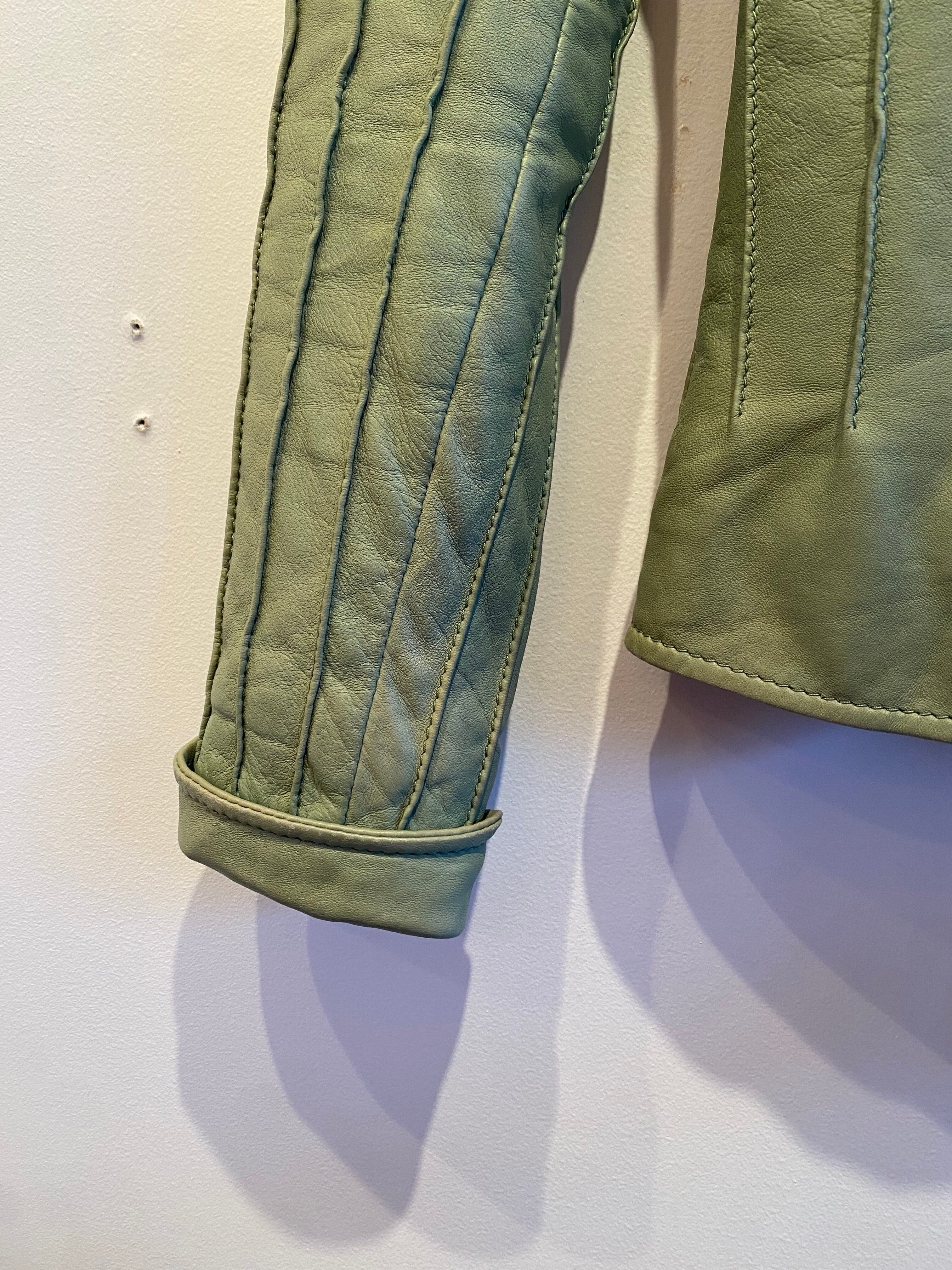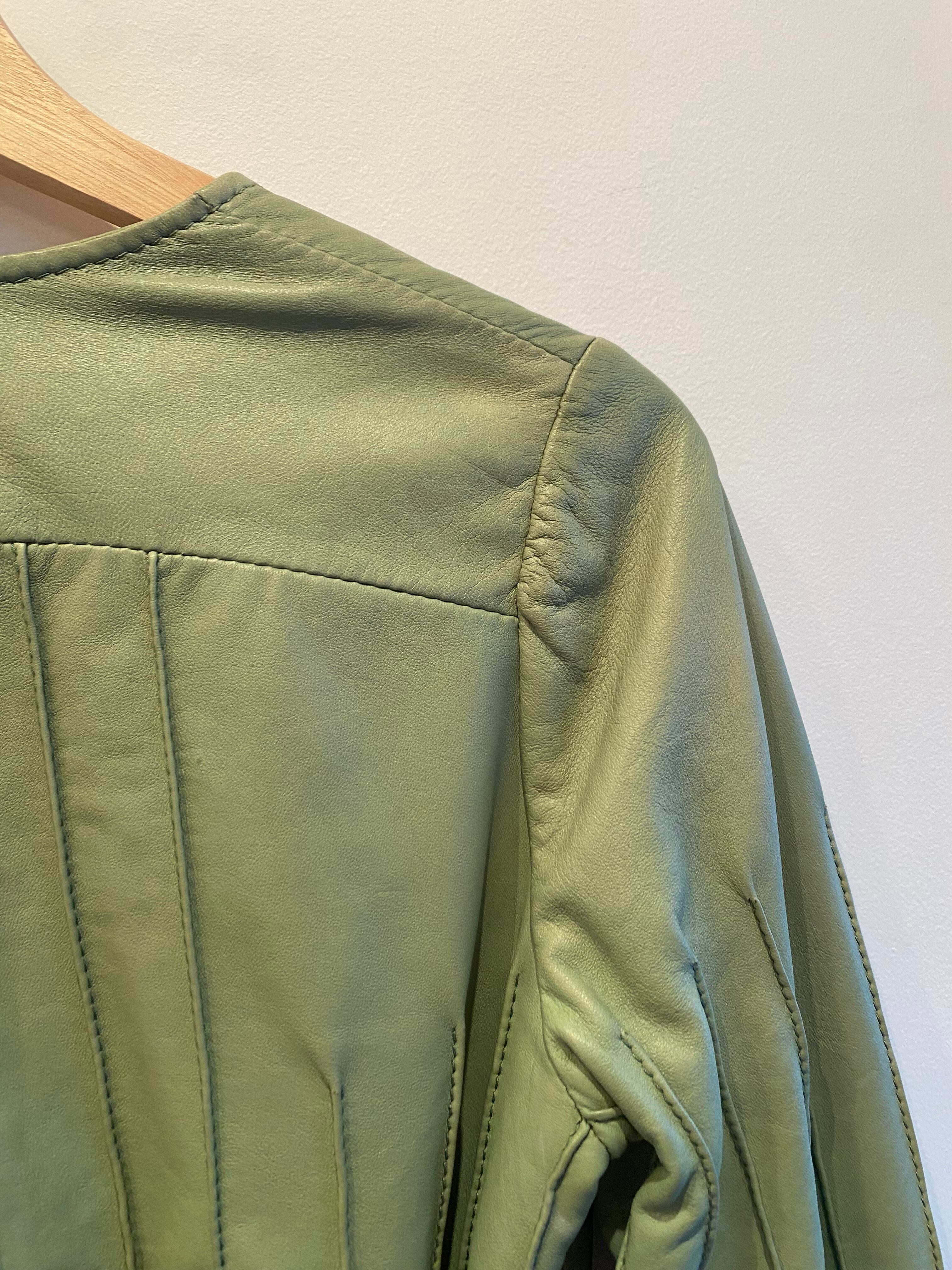 ペールグリーンのコンパクトなレザージャケット。