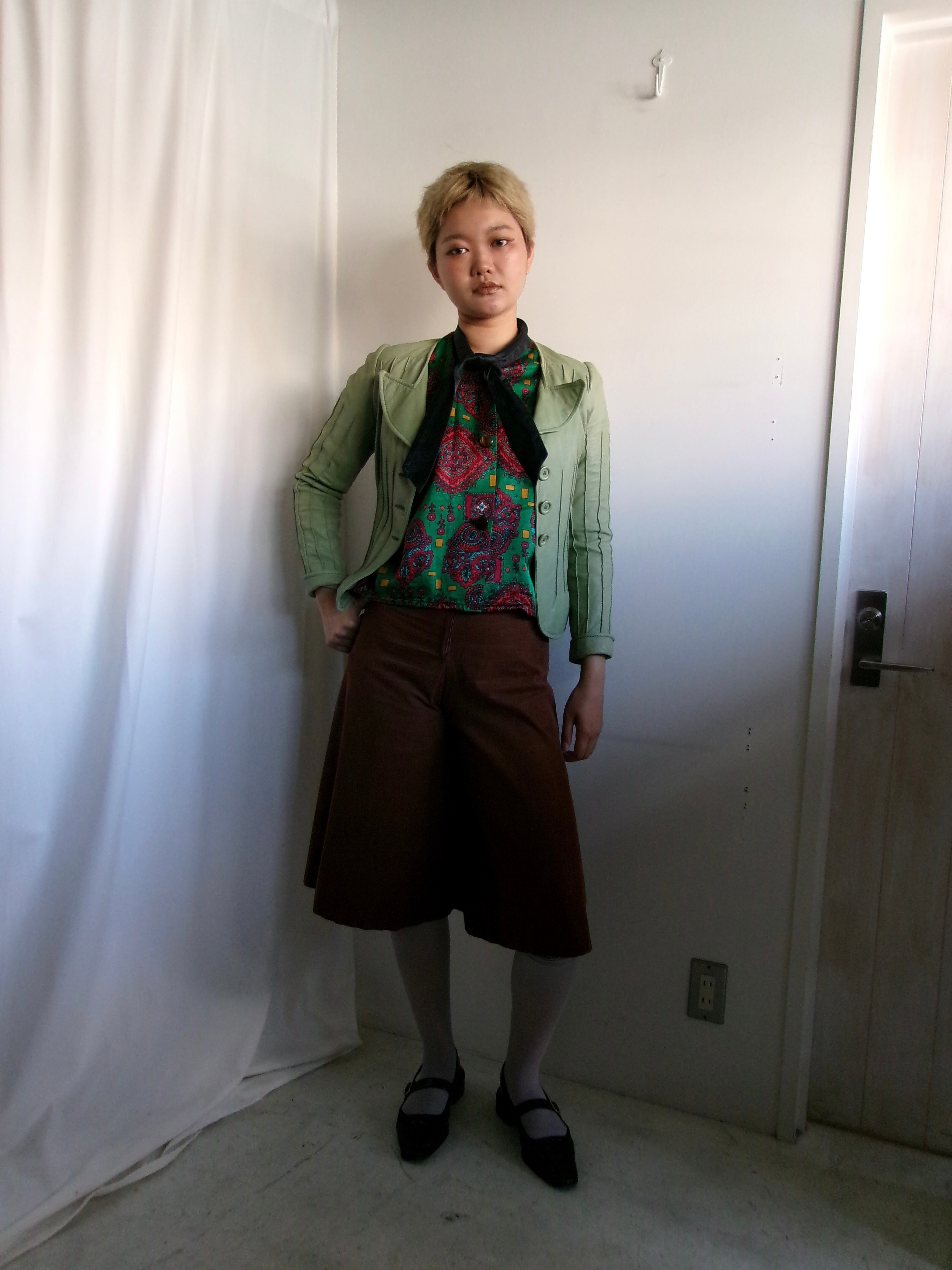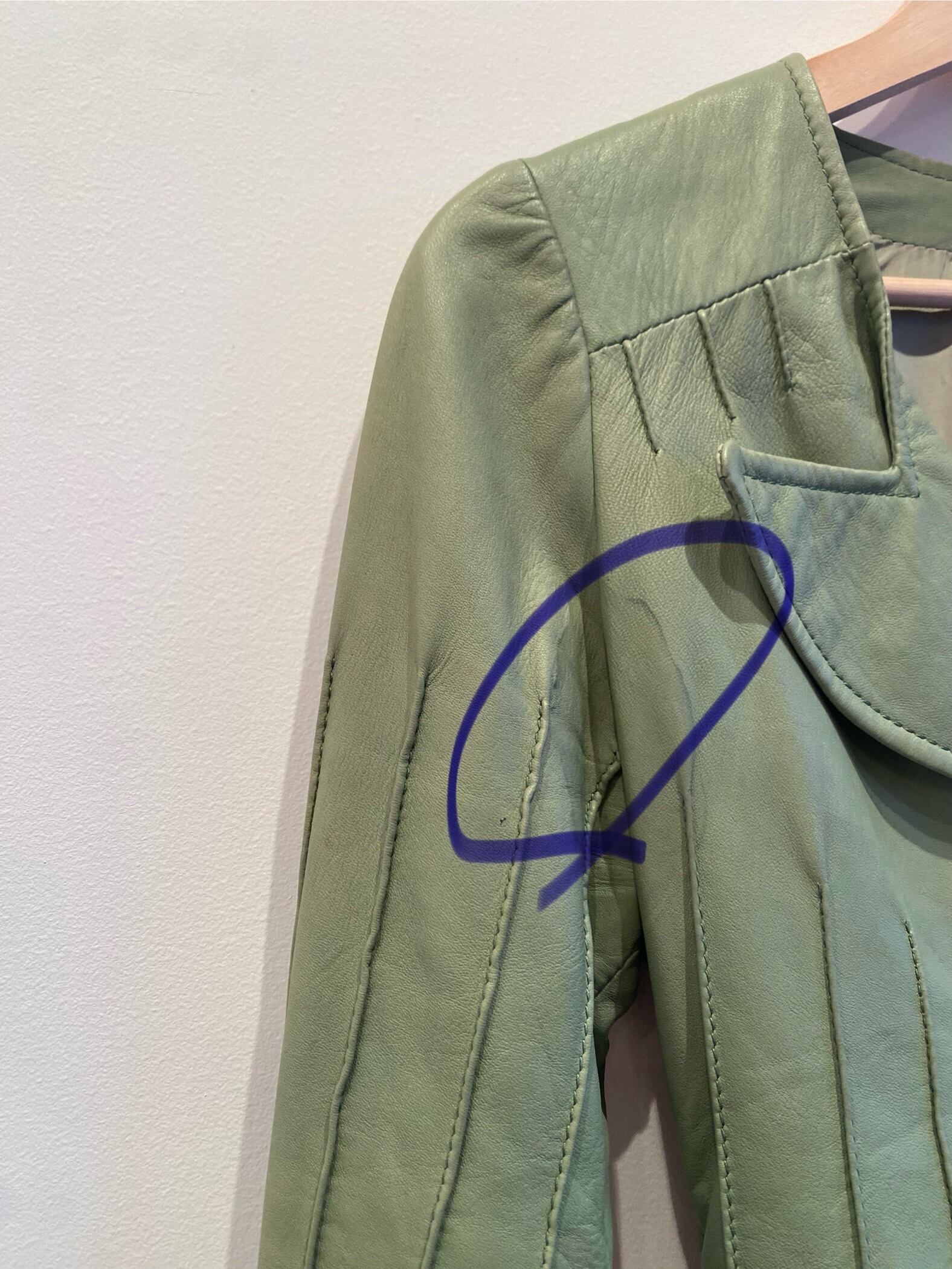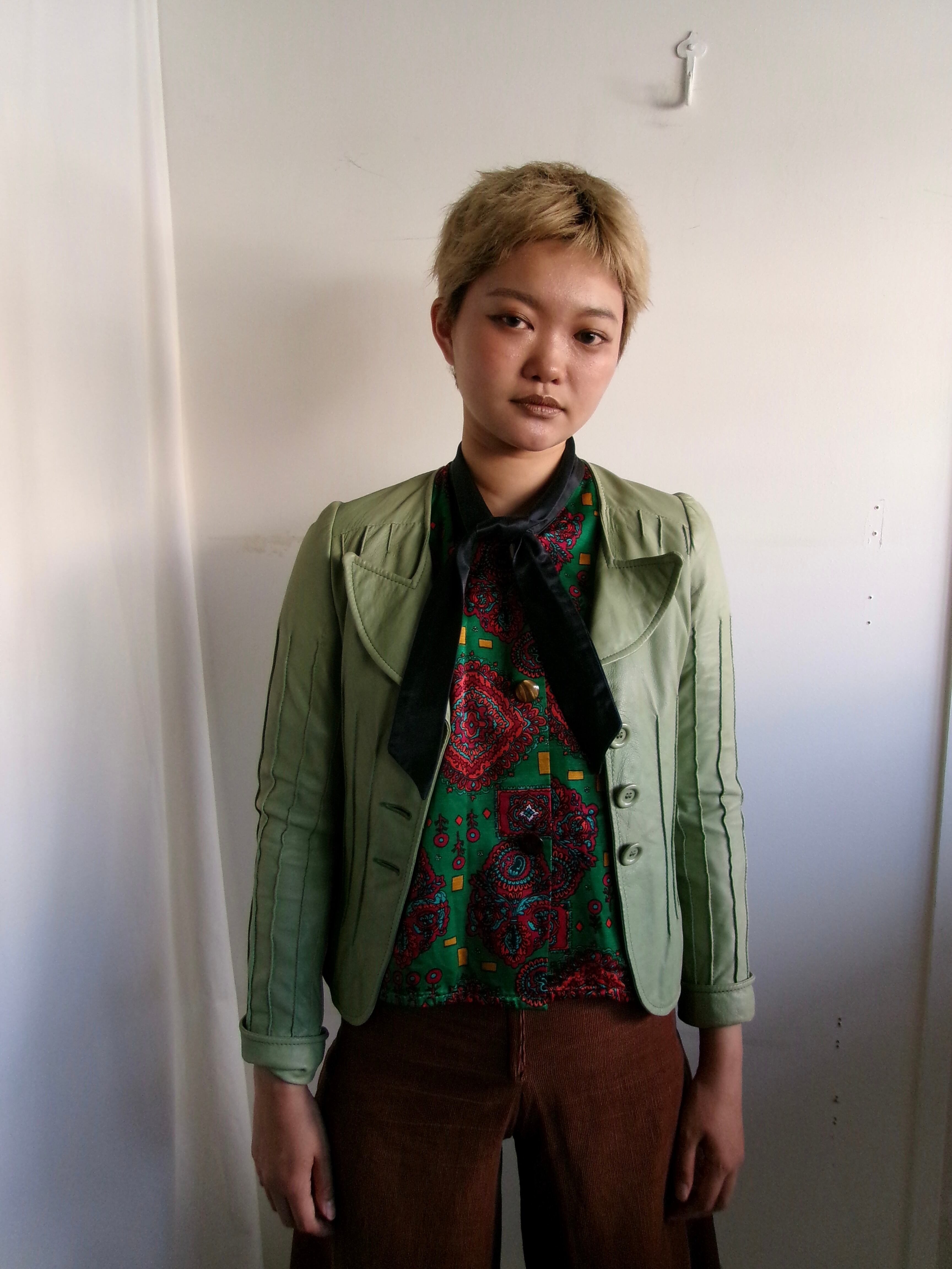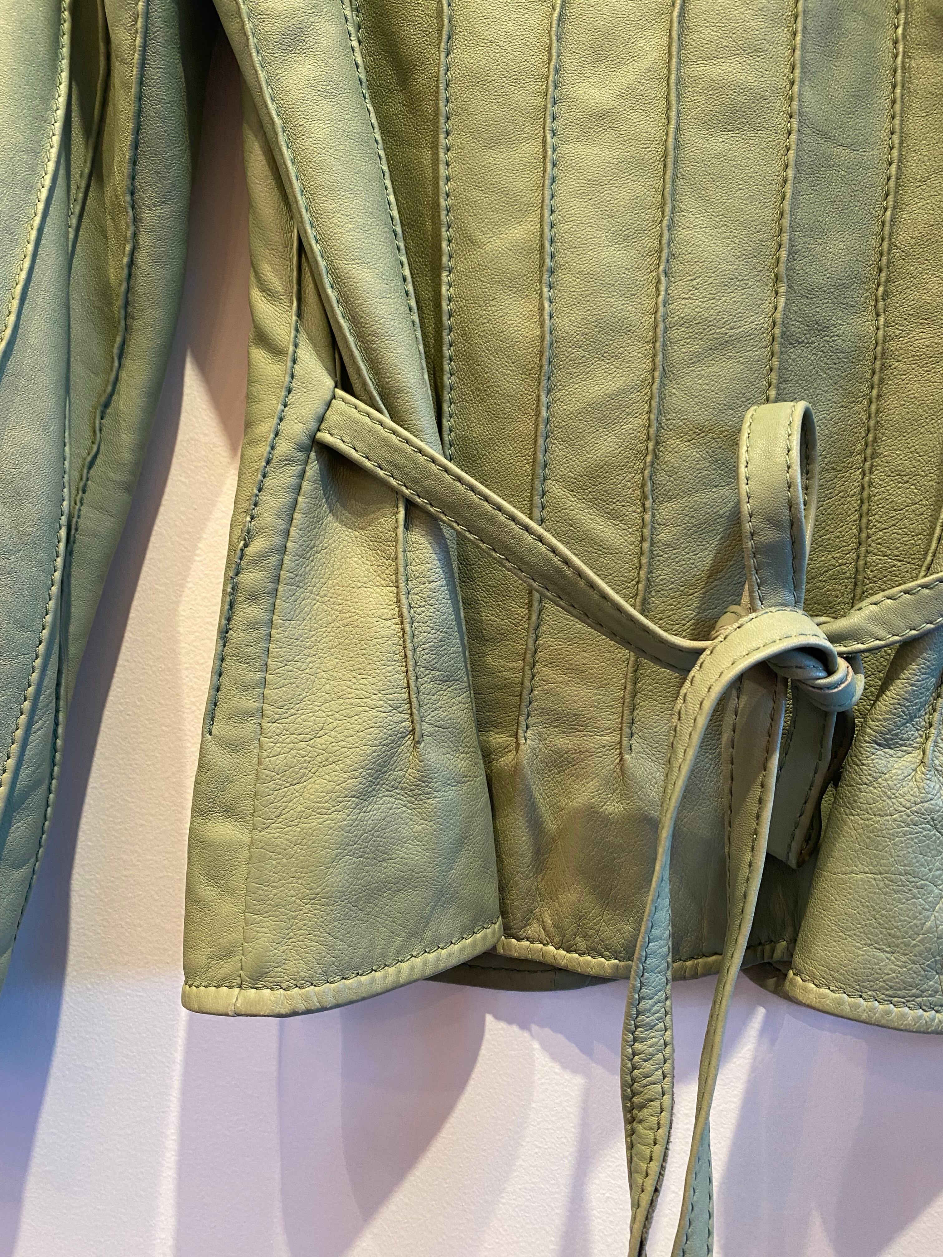 ペールグリーンのコンパクトなレザージャケット。